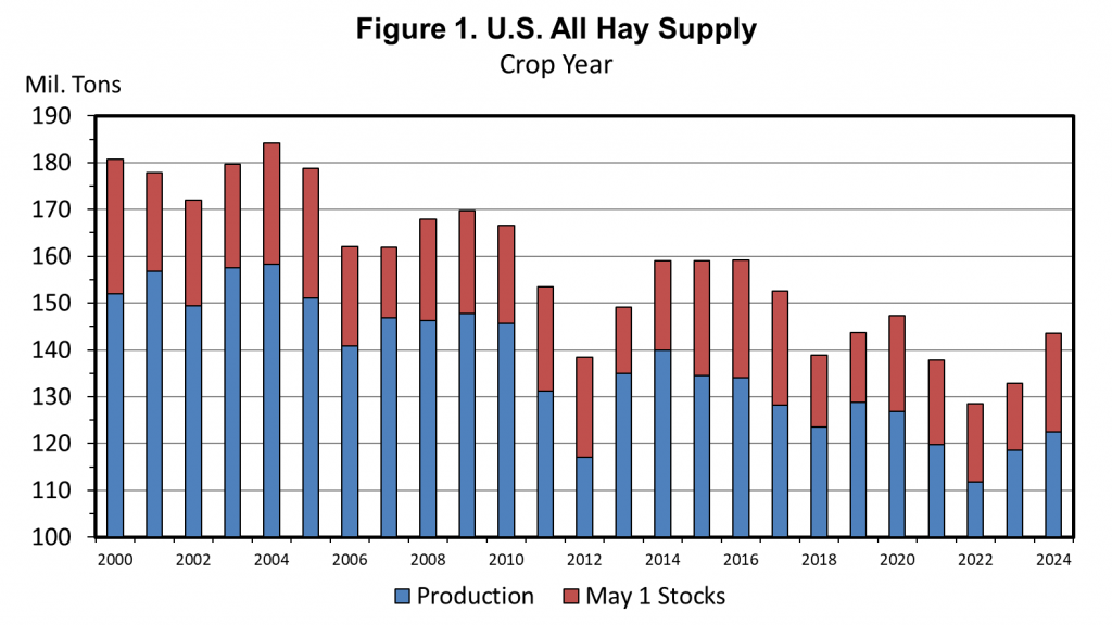 Larger May 1 stocks and increased year-over-year hay production led to larger hay supplies in 2024 (Figure 1). Total hay production in 2024 was up 3.3 percent year over year and combined with May 1 hay stocks up 46.6 percent over 2023 levels to increase the total hay supply by 7.9 percent compared to year-earlier levels. The total hay supply was 1.7 percent below the ten-year average supply from 2014-2023.