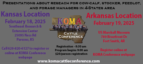 Extension staff from four states – Oklahoma State University, Kansas State University, the University of Missouri, and the University of Arkansas have again joined forces to offer a unique conference that will provide information on beef cattle production, marketing, economics, nutrition and forage utilization. Held last year in Missouri and Oklahoma, this year’s KOMA conference will be held in Parsons, Kansas and Fort Smith, Arkansas.