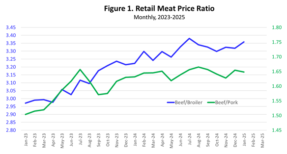 All-fresh retail beef prices continue to increase relative to pork and broiler prices as shown in Figure 1. For the past twelve months, the average ratio of all-fresh beef to broiler retail prices has been 3.31 and for beef to pork prices has been 1.65. Retail broiler prices were unchanged year over year in January while retail pork prices were up 3.3 percent from one year ago.
