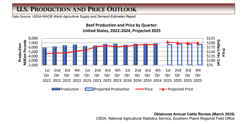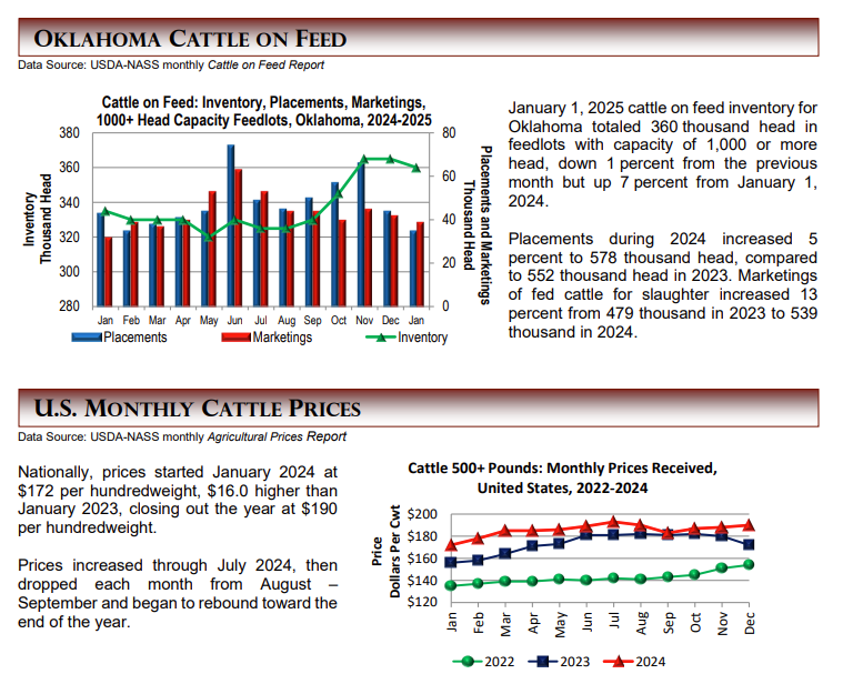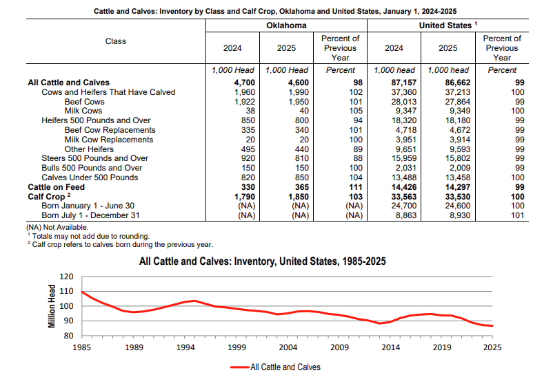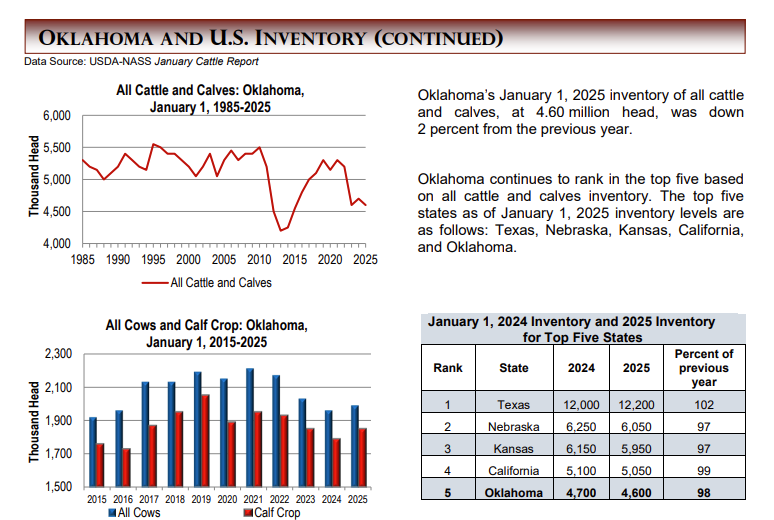 Oklahoma’s January 1, 2025 inventory of all cattle and calves, at 4.60 million head, was down 100 thousand from the