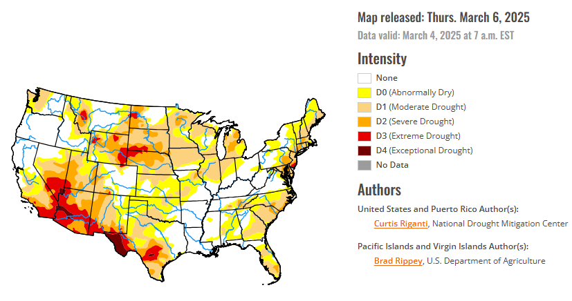 Severe drought or worse conditions remain at 0.33 percent, unchanged since January 2.