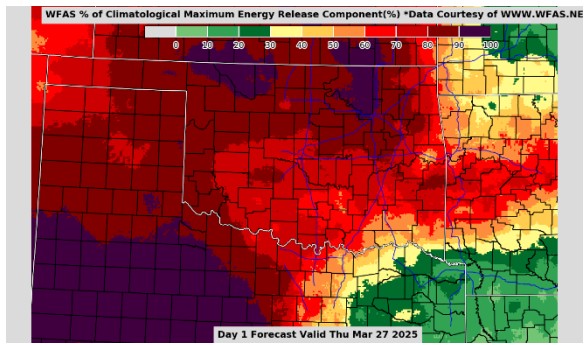 Statewide Discussion: Elevated fire weather today across the Panhandle, northwestern and far-western Oklahoma while moderated conditions are expected elsewhere. As has been previously discussed, given the composite fuel moisture along and north of I-44 less intense fire weather is required to support problematic to extreme fire behavior. As with most weather systems that traverse the Southern Great Plains during seasonal transition, there is a wet side and a fire-effective side. We will see this tomorrow and to greater extent Saturday as the dryline flexes from west to east pulsing into the Panhandle and extreme western Oklahoma tomorrow and closer to US-183 on Saturday. Energy Release Component, with direct correlation to resistance to control, has eclipsed the 80th Percentile (deep red) north of I-44 with pockets of +90th Percentile (purple). Firefighters should anticipate heavy resource commitment on any wildfire that becomes established – especially where heavier fuels are present.