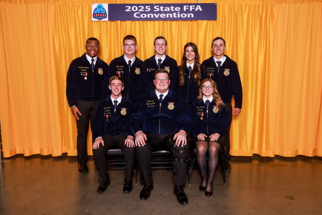 Seven additional FFA members will join Kline on the 2025-2026 Oklahoma FFA Association officer team: Coy Davidson (front left), Elgin FFA, secretary; Darla Fesmire, Oklahoma Union FFA, reporter(front right); LeAundre Delonia (back left), Okmulgee FFA, northeast area vice president; Heath Laubach, Mooreland FFA, northwest area vice president; Hudson Andrews, Purcell FFA, central area vice president; Isabella Whitlock, Silo FFA, southeast area vice president; and Bonham Eslick, Elgin FFA, southwest area vice president.