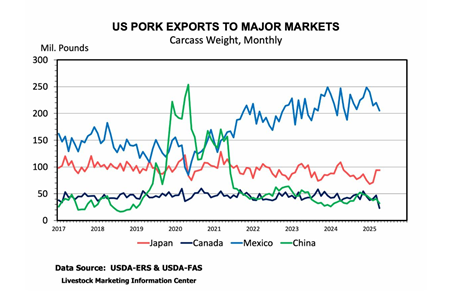 U.S. companies exported 237 million pounds of beef in April, an 18.5 million pound decline from March and 22.3 million pounds less than April 2024. Exports to China declined the most, down 27.7 million pounds, or 34 percent, compared to March. The impact of China on total U.S. beef exports was partially offset by larger exports to Japan, South Korea, and Hong Kong. It’s not unusual for beef exports to decline from March to April. On the pork side, exports declined 58 million pounds, or 9 percent, from March, and 73 million pounds less than April 2024. Shipments to most markets declined, led by Canada, Mexico, and China. The decline in pork exports to Canada accounted for 41 percent of the total export reduction from March.