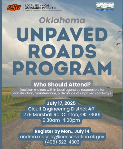 Oklahoma Unpaved Roads Program is designed to assist local agencies in learning cost-effective strategies and techniques for mitigating drainage issues and improving the performance of unpaved roads.