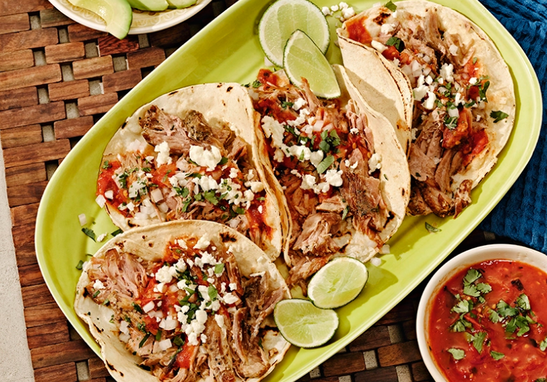Tender carnitas piled high with vibrant toppings makes for a flavor-packed meal that’s both hearty and fresh. The juicy, slow-cooked pork pairs perfectly with rice, black beans, and pico de gallo. Try it in a bowl, with warm tortillas or stacked on a pile of salty tortilla chips