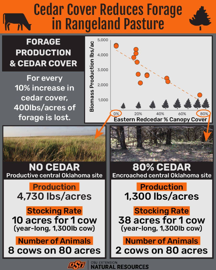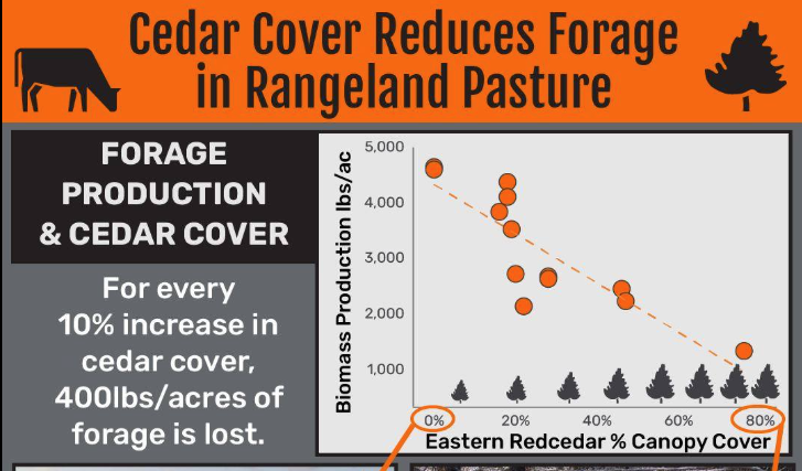 For every 10% increase in cedar cover, 400lbs/acre of forage is lost.