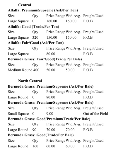 Compared to the last report. Demand is slow. There are some movements, but not enough for a trend for all types of hay. Oklahoma has been able to bale hay over the past few weeks. Some areas are requesting another rain shower to see if they can get one more cutting of hay, while others are in good shape with the amount that they have baled this year. We continue to experience heat in Oklahoma, along with high humidity.