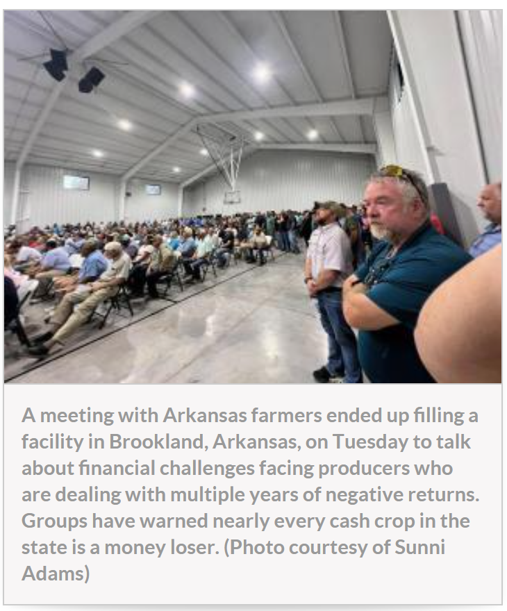 In an Article for DTN Chris Clayton Writes: Hundreds of farmers in northeast Arkansas met Tuesday with federal officials to talk about their current financial challenges and fears they could be forced to walk away from farming.