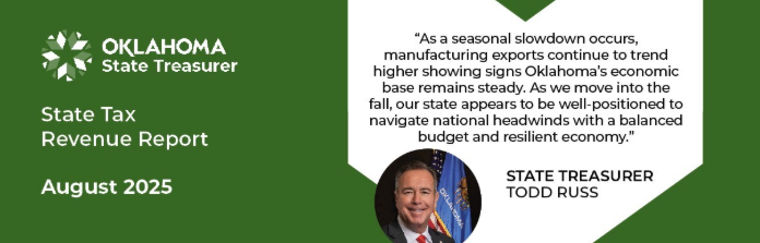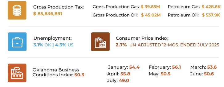 The state’s Business Conditions Index for August rose to 50.3 from 49.0 in July. Components of the overall July index were: new orders at 49.4; production or sales at 52.9; delivery lead time at 55.6; inventories at 49.5; and employment at 44.1. According to ITA data, the Oklahoma manufacturing sector exported $3.5 billion in goods for the first five months of 2025, compared to $3.3 billion for the same period in 2024, for a 4.5% gain.