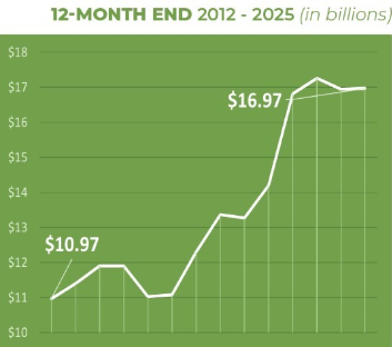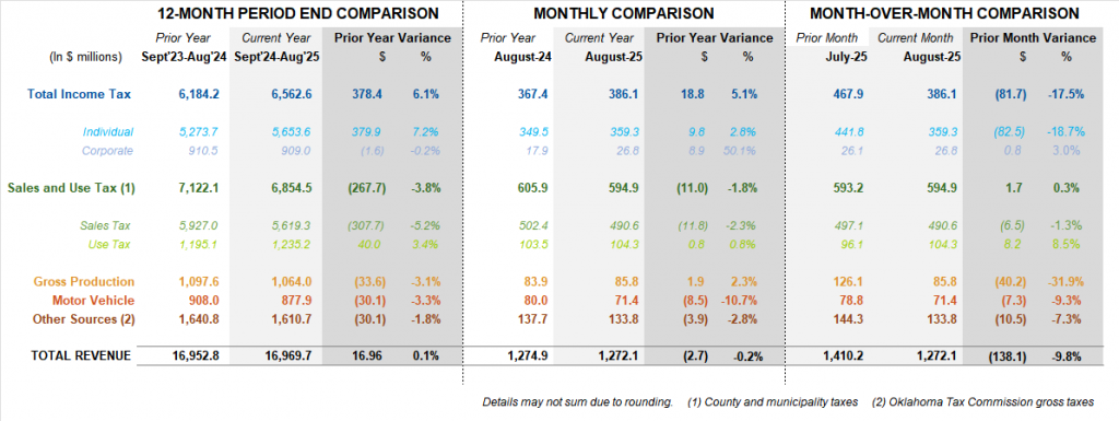 Tax Revenue total of $1.27 billion, down $2.7 million or 0.2 percent for August 2025 vs. 2024.