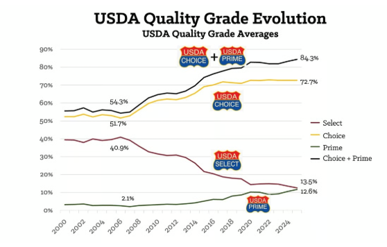 USDA Prime accounts for 12.6% of carcasses today, with combined USDA Choice and Prime reaching 84%. While higher quality cattle flood the market, the Select supply continues to drop.
