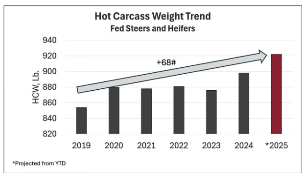 The 2020 fed cattle supply backlog, instigated by the pandemic, boosted carcass weights by 26 lb. This unprecedented event was logically expected to undergo a correction with weights returning nearer to the pre-pandemic trendline as fed cattle supplies normalized in 2021. Yet, the correction did not materialize, as annual average weights only declined 2 lb. in 2021 to average 878 lb., still 24 lb. heavier than the pre-pandemic level. A 3 lb. increase in 2022 set a new annual record before the following year’s 5 lb. decline, which would be considered a bit of a normalization. However, winter weather in 2023 was devastating in the feeding sector, removing a month’s worth of gain and dragging weights dramatically lower to start the year. The bottom line is, despite brief weather disruptions, target feedlot out-weights have only increased since the pandemic. The beef industry simply accepted a paradigm shift adding 26 lb. of carcass weight to the trend line in a single year. Little did we know in 2020 that we’d add another 40 lb. to the ledger by 2025.
