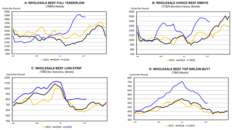 Figure 1 shows weekly prices for popular steak products. Beef tenderloin, after being relatively weak in 2024 and early 2025, has increased sharply in the third quarter (Figure 1 A). Tenderloins are typically strong in the fall and winter as restaurant traffic increases, with a bump in May for Mother’s Day. Panel B in Figure 1 shows wholesale ribeye, strong going into summer and again in the fall in anticipation of restaurant holiday Prime Rib demand. Strip loins were very strong in the first half of the year, then dropped sharply mid-summer before stabilizing the last few weeks (Figure 1 C). Top sirloin, popular for summer grilling, peaked mid-summer and has declined seasonally through the third quarter of the year (Figure 1 D). All of these wholesale values are well above year-ago levels.