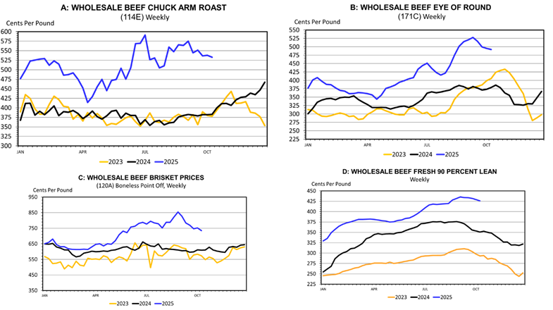 Fall and winter weather and the upcoming holiday season change the relative demands for various beef products, but overall beef demand continues strong. Wholesale and retail beef prices will be supported by strong demand and continued decreases in beef production.