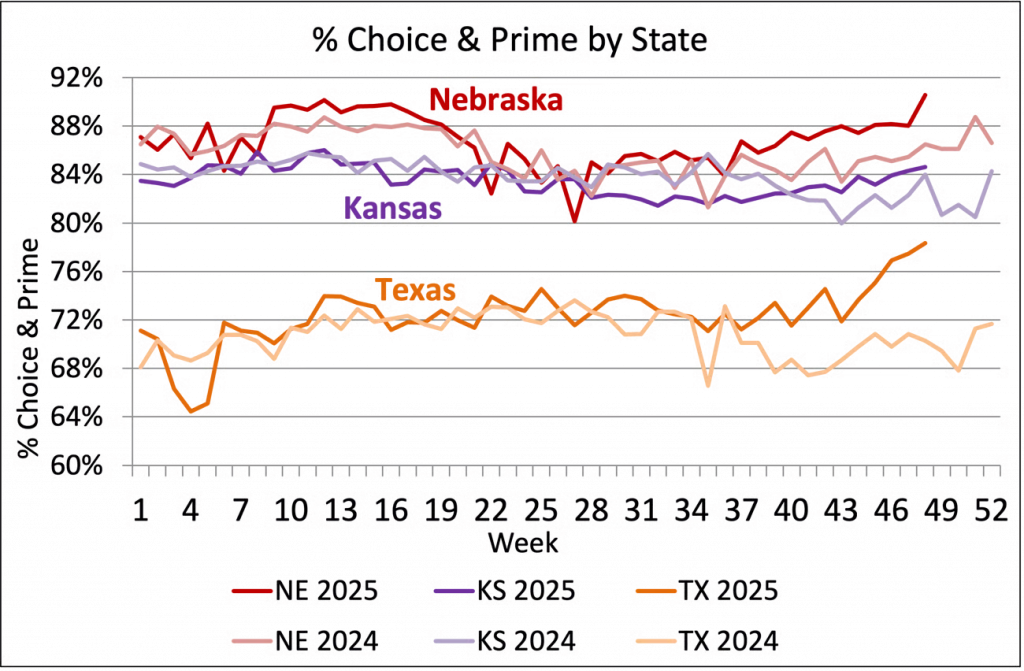 On the other hand, Texas feedyards currently have the least occupancy with their cattle inventory hindered by the absence of Mexican cattle. Even so, the Texas grade trend is also charting much richer this season. While the state’s Prime grade is exceptional compared to history, averaging 7.8% since June, the uptrend in USDA Choice is notable. The Texas Choice grade average moved little on either side of 64% through October this year. Yet the last four weeks saw Choice carcasses jump to average almost 69% of the total, while the Prime share gave no ground, averaging 8.1% in the past month.