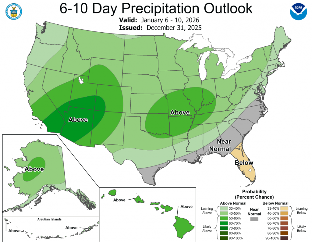 According to the 6-to-10-day precipitation outlook map, central and eastern Oklahoma are leaning above 50-60% chance of rain while western Oklahoma is leaning above 40-50% chance of rain through January 10th.