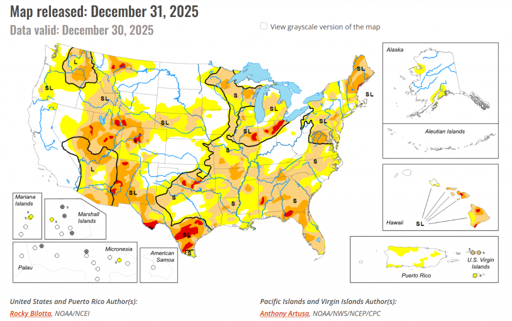 This week, a massive heat dome settled over the central and southern United States, creating unprecedented warmth for the holiday week. This high-pressure system shattered daily high-temperature records, with readings soaring 15 to 35 degrees above average across the region. Numerous daily records were broken between December 24 and December 27, contributing to what was forecast to be the warmest Christmas Day on record for the contiguous U.S. The weather pattern snapped violently late in the weekend as a powerful winter cyclone swept eastward from the Plains between December 27 and 29. This system drove a sharp cold front through the South, causing temperatures to plummet from record highs to near freezing overnight. Simultaneously, the storm unleashed severe winter conditions across the Upper Midwest and Great Lakes, delivering blizzard conditions and up to two feet of snow near Lake Superior, alongside significant ice accumulations that snarled travel in parts of the Northeast. Precipitation was near- to below-normal for much of the country, while much of the West, and parts of the Midwest and Northeast observed above-normal precipitation during this week. The West Coast was a notable exception where a strong atmospheric river brought heavy precipitation to most of California, dumping over 10 inches of rain in some areas and several feet of new snow in the mountains.
