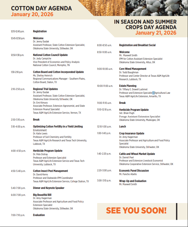 The conference will feature a “star-studded” lineup of speakers, including Dr. Amy Hagerman discussing estate planning and the farm bill, and Dr. Derrell Peel providing updates on cattle and wheat markets.