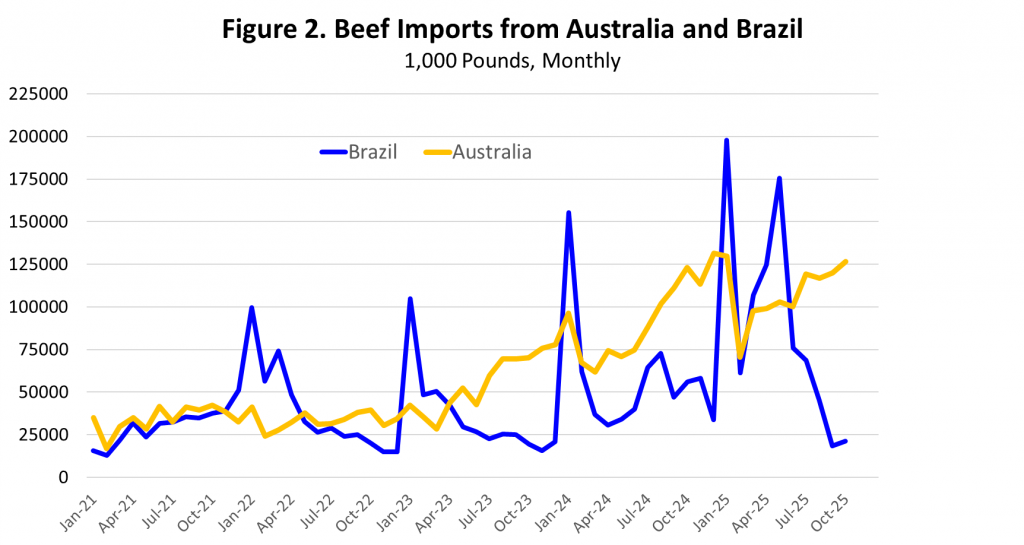 Through October, Australia was the largest source of U.S. beef imports with a 23.6 percent share of total imports. Number two Brazil accounted for 19.5 percent of beef imports, followed by Canada (18.2 percent share), Mexico (12.3 percent share), New Zealand (10.8 percent share), and Uruguay (6.8 percent share). Despite much political focus on Argentina in the fourth quarter of 2025, Argentina only represents about 25 percent of the “Other” category in Figure 1, representing 2.2 percent of total beef imports.