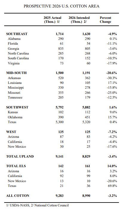 U.S. cotton producers intend to plant 9.0 million cotton acres this spring, down 3.2 percent from 2025, according to the National Cotton Council’s 45th Annual Early Season Planting Intentions Survey.
