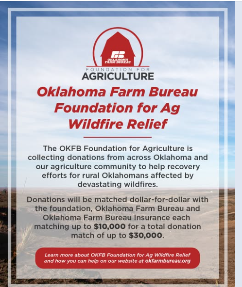 The Oklahoma Cattlemen’s Foundation (OCF) has established a relief fund to help cattle producers who have been affected by the recent wildfires in Northwest Oklahoma. “We are coordinating with boots on the ground leaders in the Panhandle and Northwest to identify ranchers that are in need,” said Michael Kelsey, Executive Vice President of the Oklahoma Cattlemen’s Association. “The wildfire relief fund at the Oklahoma Cattlemen’s Foundation will distribute 100% of received funds to impacted cattle producers. The OCF will establish an application process later this week and encourage impacted producers to let us know the extent of the damage to their cattle operation so we can help directly.”