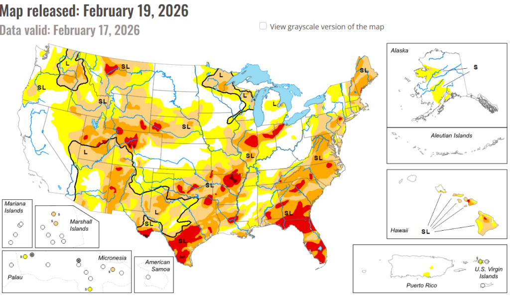 Oklahoma continues to face dry conditions, with the latest Drought Monitor showing nearly three-quarters of Oklahoma affected by moderate to extreme drought, unchanged from last week. While extreme drought has eased slightly to just over 9 percent of the state, large areas remain dry, and the 6-to-10-day outlook leans toward below-normal precipitation chances through late February. These ongoing conditions, combined with recent warm and dry wind, are contributing to an elevated wildfire risk, with fires already devastating parts of the state.