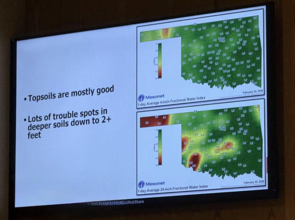 The conversation also turned to soil moisture, which had held up better earlier in the season. McManus said, “At least the topsoil… has been replenished” thanks to late-January snow and ice, but warned deeper soil layers are in rough shape. “When you get below… two to three feet, it’s pretty bad over a good portion of the state,” he explained, adding that warming temperatures and wind will cause surface moisture to “deteriorate rapidly.”