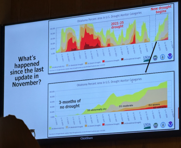 McManus explained that Oklahoma briefly caught a break last summer, but that relief didn’t last. “We had a good three to four months of very little drought,” he said, before conditions shifted rapidly. According to McManus, “Concern started early in the fall… a very warm period, a very dry fall, and then an even drier winter,” with temperatures staying above normal since August—an unhealthy combination that has accelerated drought development.