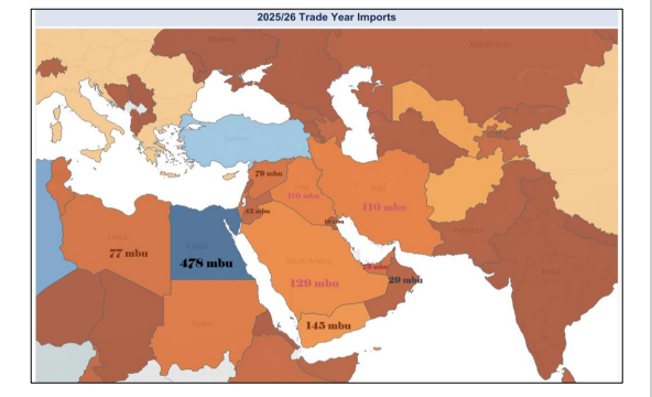 According to Hubbs, “Geopolitics and weather underpin wheat market activity at present.” The escalation of hostilities with Iran is occurring in a region that constitutes large demanders of wheat in the global market. Middle East nations account for over 700 million bushels of trade year imports for 2025/26. Hubbs highlighted that the threat to shipping in the Arabian Gulf via the Strait of Hormuz impacts oil and all bulk shipping, adding, “The impact on wheat markets if the conflict spreads to interference in the Red Sea could be quite profound.”