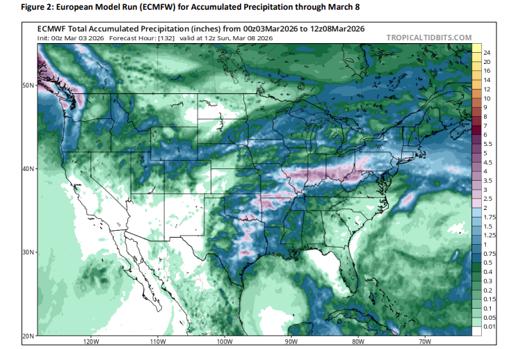 Domestically, dryness remains a prominent issue. While recent model runs have pushed potential moisture further west in Oklahoma, Hubbs remains cautious. “For clarity, my faith in weather models outside of three days is quite low,” he said. Recent conditions for winter wheat show that 50 percent of the acreage is in a level of drought, with abnormally dry areas expanding. “The light totals predicted in western Oklahoma and Kansas are lacking for the level of need,” Hubbs noted.