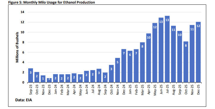 Milo Market Trends: Milo remains dependent on the export market and corn price competitiveness. Hubbs reported that milo basis is “quite weak,” with cash prices ranging from $3.34 to $3.44. China remains the only major player in U.S. milo export markets, and while industrial usage was up in December, the outlook remains tied to international trade. “Recent developments on the geopolitical front add more uncertainty to this outcome,” Hubbs concluded.