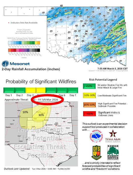 • Western/Southwest Oklahoma: Heavy cloud cover and moist air are limiting fine fuel receptiveness. However, lightning remains a concern for new ignitions, with potential for “holdover” fires that could emerge when the dryline arrives on Friday.