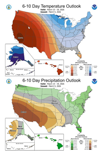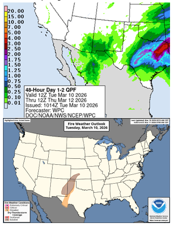 The Quantitative Precipitation Forecast indicates that the best potential for wetting rainfall has shifted further south over the next two days. As this weather system passes, dry conditions are expected to return, coupled with a drier-than-normal outlook for the next ten days.