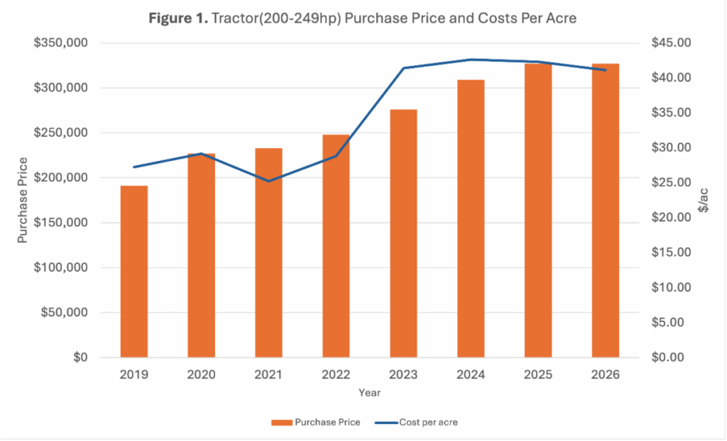 Figure 1 shows the purchase price for a 200-249 horsepower tractor across time. In 2019, the cost of buying this tractor was around $191,000. For 2026, the cost of this same size tractor is now $327,000, an increase of 71% (well above the rate of inflation). Also included in Figure 1 are the costs per acre for that tractor. Costs per acre are based on machine cost calculations that include labor, fuel, interest, taxes, insurance, housing, and depreciation costs. In this case, assuming that the tractor is used over 2,000 acres, the costs per acre for this tractor increased from $27.24/ac up to $41.11/ac. In other words, the same size tractor today is going to cost you $13.86/ac more than it did 7 years ago if your acreage has not changed. A producer would have to use the new tractor over 3,018 acres in order to have the same costs per acre, $27.24/ac, as it did in 2019. These per acre costs do go down on occasion, particularly when fuel prices or interest rates decline.