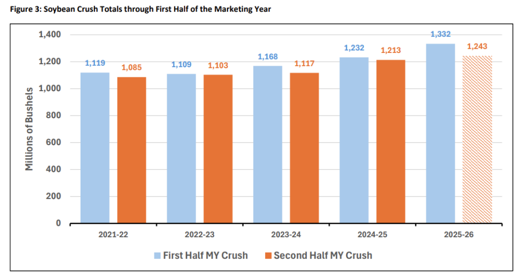 The soybean complex is finding its strongest support from the domestic crush sector rather than international sales. Driven by expectations of supportive Renewable Volume Obligations from the EPA, the U.S. soybean crush is moving at a historic pace. Through February, the crush totaled an estimated 1,332 million bushels, an 8.1 percent increase over the previous year.