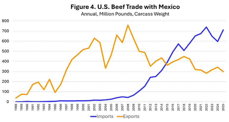 U.S. imports of Mexican cattle are part of an increasingly integrated cattle and beef trade relationship between Mexico and the U.S. Mexican cattle imports have been important for many decades. In the 1980’s Mexico became a significant beef export market for the U.S and is currently the number three beef export market (Figure 4). More recently, after 2010, Mexico has become a significant source of U.S. beef imports, currently the number four source of beef imports (Figure 4). Cattle and beef trade between the U.S. and Mexico are interrelated markets so the current disruption in cattle movement across the border may have a variety of impacts in the future.
