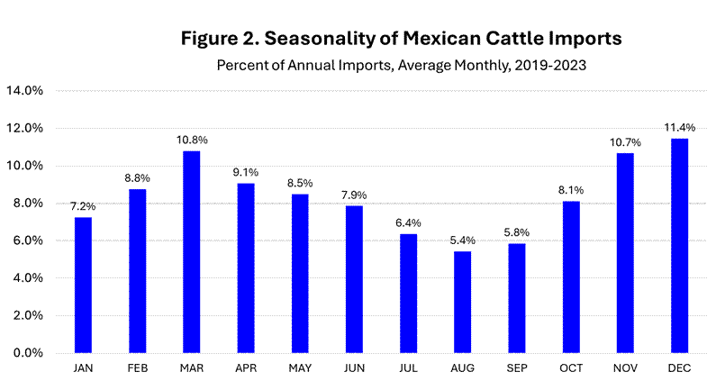 Prior to the border closing in November 2024, U.S. imports of Mexican cattle had averaged 1.18 million head annually in the previous decade (Figure 1) and 1.12 million head per year in the previous 35 years. Mexican cattle imports equaled 3.4 percent of the total U.S. calf crop from 2015-2024 and 3.1 percent since 1990. The brief border opening in 2025 allowed about 230,000 head to cross, 0.7 percent of the 2025 calf crop.