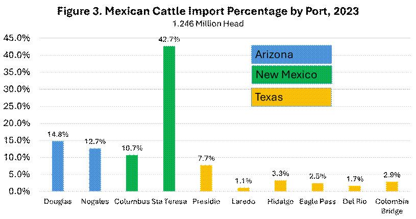 Figure 3 shows the distribution Mexican cattle imports by port in 2023, the last year with a fully open border. The largest port is Santa Teresa, New Mexico, which accounted for nearly 43 percent of cattle crossing. Along with the Columbus port, New Mexico accounted for over 53 percent of total cattle imports. The ports at Nogales and Douglas in Arizona represented another 27.5 percent of cattle crossings. The six ports in Texas accounted for a total of 19.2 percent of total Mexican cattle imports. The largest Texas port is Presidio/Ojinaga with 7.7 percent of the total.