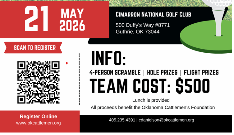 Rally your friends and join us in Guthrie on May 21 for the Oklahoma Cattlemen’s Association Leadership Academy Golf Tournament at Cimarron National Golf Club.   Located at 500 Duffy’s Way #8771 in Guthrie, Cimarron National Golf Club features two 18 hole courses, Aqua Canyon and Cimarron National.   Registration is $500 for a four person team. Do not miss the chance to enjoy a great day of golf while supporting the next generation of leaders in the cattle industry. Interested in sponsoring? You can find sponsorship details and register by clicking the button below.