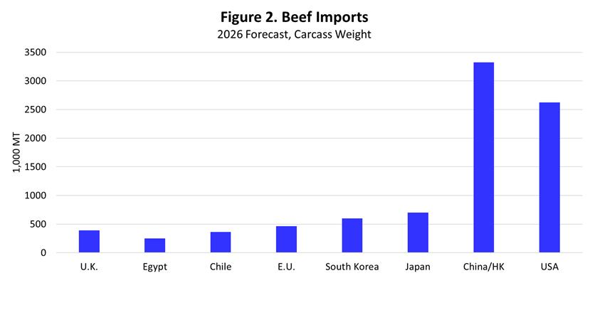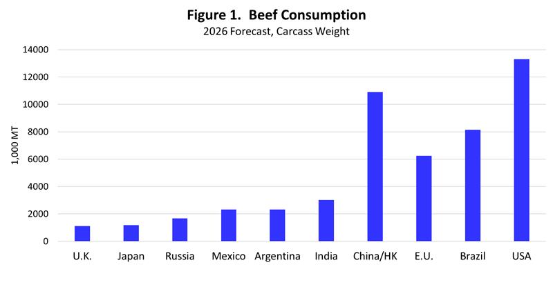 Global beef consumption in 2026 is projected at 59.5 million metric tons (mmt), down 1.4 percent year over year, largely due to decreased beef consumption in China.  Global beef consumption has increased an average of 0.8 percent annually in the last 46 years, from the 1980 level of 42.4 mmt.  The U.S. is the largest beef consuming nation, accounting for 22.4 percent of total global beef consumption in 2026.  The U.S. has averaged 23.3 percent of global beef consumption since 1980.