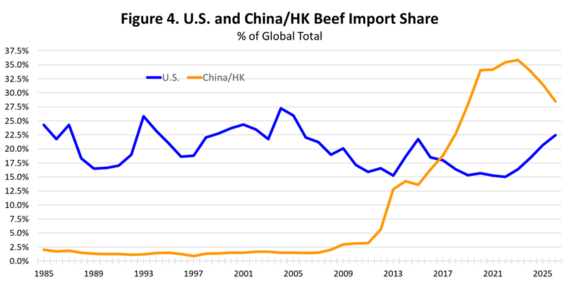 Figure 4 shows the rapid increase China/HK beef imports as a share of global total imports, pushing China/HK ahead of the U.S. since 2017.  The U.S. share of global beef imports has remained relatively steady for many years.