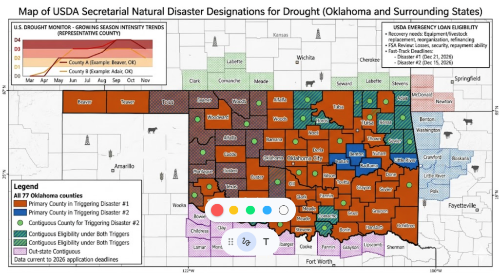 Agricultural producers across Oklahoma and four neighboring states are now eligible for federal assistance following a Secretarial natural disaster designation by the United States Department of Agriculture. This designation triggers the availability of emergency credit through the Farm Service Agency for producers grappling with the impacts of severe and extreme drought.