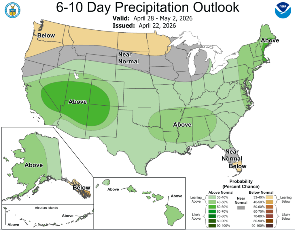 According to the 6-to-10-day precipitation outlook map, most of Oklahoma is leaning above a 33-40% chance of precipitation through May 2nd, while southeastern Oklahoma is leaning above 40-50% through the same date.
