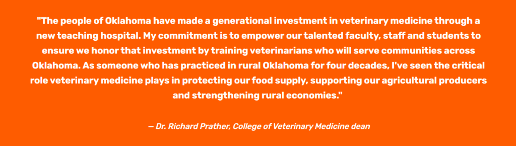Prather brings four decades of veterinary practice experience and extensive relationships across Oklahoma’s veterinary, agricultural and industry communities as the college prepares to build a transformational $329 million teaching hospital. The facility will replace the current 40-year-old hospital and position OSU among the nation’s premier veterinary programs.