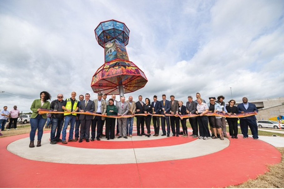 Three new works of public art were dedicated Thursday in Wellston on the iconic U.S. Route 66 where it intersects with the I‑44/Turner Turnpike. The pieces celebrate the community, the Mother Road, and Oklahoma’s enduring role as a crossroads of culture and connection. The public event also marked the ribbon cutting of the newly reconstructed $48 million Turner Turnpike bridge above Route 66.