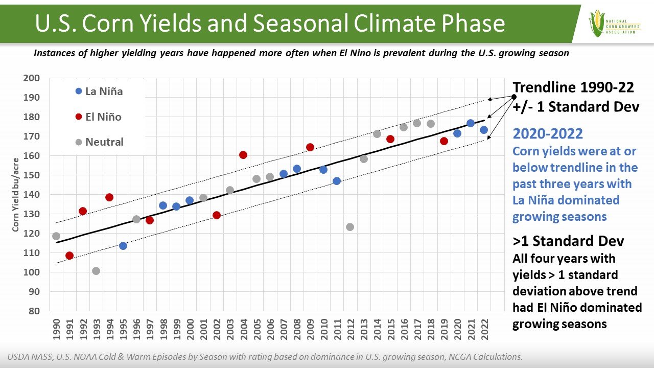 In March, the National Oceanic and Atmospheric Administration (NOAA) reported the end of La Niña, a phase of the recurring climate patterns in the tropical Pacific that influence climate patterns in various parts of the world including the United States. While currently in the transition phase, in May NOAA forecast a greater than 90% chance of El Niño conditions developing within the next couple of months. El Niño tends to bring favorable growing conditions for crops in the Midwest, so it is a welcome transition for farmers after three growing seasons of La Niña, all of which were at or below trendline yield years for U.S. corn. Since 1990, most years with an El Niño dominated growing season have had corn yields above trendline, often exceeding a standard deviation above trend and never lower than a standard deviation below trend. Corn yields in years with a La Niña dominated growing season tend to be near or below the trendline.