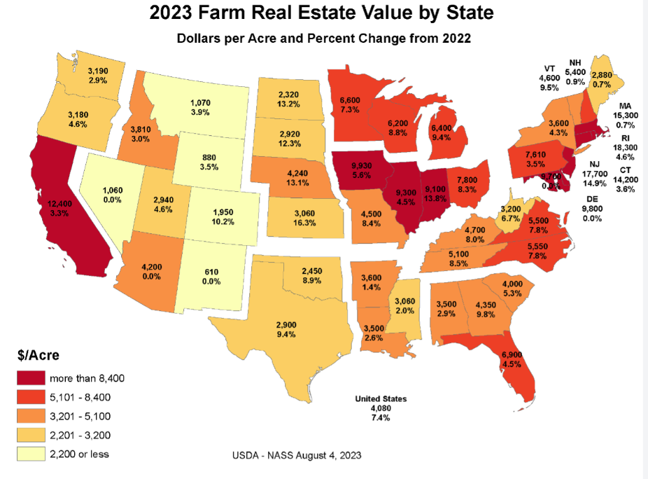 In August 2023, the USDA National Agricultural Statistics Service published their annual report of state-level land values for farm real estate, which includes both cropland and pasture values. The results of the report indicate a strong market in the Southeast, with Georgia leading the region at a 9.8% increase in 2023 farmland values over 2022. The overall increase for the United States was 7.4%, and Kansas led the nation with a 16.3% increase in farm real estate values from 2022.