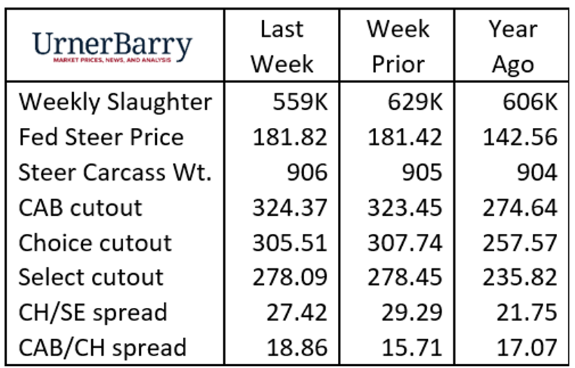 Last week’s fed cattle slaughter was remarkably small even considering that Labor Day shortened the production week for packers. The 559,000 head federally inspected total was 47,000 head smaller than the same week a year ago. On the other hand, fed steer and heifer slaughter Tuesday through Friday averaged 100,000 head per day. Fed cattle prices remained essentailly unchanged last week at $181.82/cwt. The negotiated head count was quite small and limited packer demand kept a lid on potential for upward price movement. |