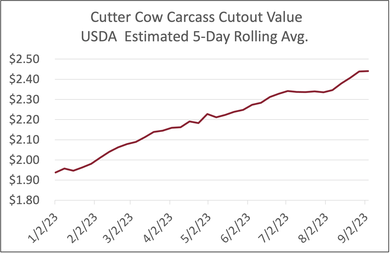 Record-high cutter cow values create record-high 90% lean trim prices, which have recently touched $3.11/lb. This price spike has sent ground beef processors seeking alternatives, as high prices often do. Fed steer and heifer cuts from the round primal are a logical substitution in this scenario and prices for round cuts are showing positive price moves in the latest reports, lifting the total carcass value contribution attributed to the round. The Choice round primal price, for instance, has lifted 15.6% and the CAB cutout is up 13.7% since August 1. Total carcass cutout prices have tended to increase during August in most recent years, but round cuts are holding the stronger price spike this season longer into September due to the substitution effect noted above. |